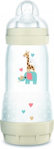 בקבוק אנטי קוליק 320 מ’’ל 4+ חודשים MAMהתחלה קלה נגד גזים, בקבוק עם תחתית מתברגת מלמטה.מנגנון למניעת גזים הוא אחד מהפיתוחים החדשניים של חברת MAM.הבסיס המאורר עובד על השיטה הייחודית המאפשרת זרימה שוטפת ואידיאלית של המזון.האויר נכנס דרך חורי האיוורור מתחתית הבקבוק ובכך מונע ואקום ומאפשר הנקה שוטפת,ללא הפסקות וללא בליעת אויר.התוצאה: בהאכלה מבקבוק נגד גזים של MAM התינוק נשאר רגוע ושקט ואינו בולע אויר ולכן גם סובל פחות מגזים וכאבי בטן.הבקבוק אושר כמונע גזים ע"י 80% מהאמהות* (*מחקר שוק, אוסטריה 2011, נבדק עם 73 אמהות לתינוקות הסובלים מגזים, ארה"ב 2010 נבדק עם 35 אמהות לתינוקות הסובלים מגזים, מחקר רפואי ארגנטינה 2012, נבחן על 34 תינוקות).סקאלת מדידה על המכסה מאפשרת למדוד את הנוזלים שנותרו בתחתית הבקבוק (את אלו שלא ניתן לראות מתחת ל- 60 מ"ל בגלל הפתח התחתון).