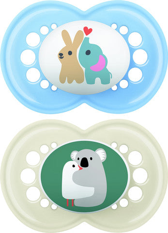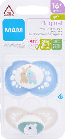 זוג מוצצי מאמ מסיליקון לגיל 16 חודשים ומעלה, עם פטמה אורתודנטית סימטרית.