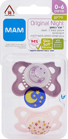 זוג מוצצי מאמ מסיליקון לגיל 0-6 חודשים, זוהרים בלילה, עם פטמה אורתודנטית סימטרית.